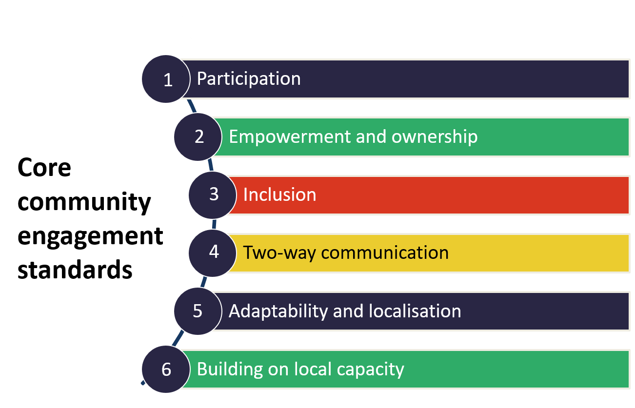 To ensure that community members and other stakeholders involved in our advisory groups have a positive experience, we regularly monitor and evaluate our community-related activities, via a range of qualitative methods. The six core standards outlined in the UNICEF minimum standards for community engagement, which are underpinned by a human rights and community-based approach, guide our community engagement and involvement in ECLIPSE and its evaluation.